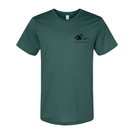 Jester Goods Logo and DE-NY-FEND-POSE Graphic Organic Crewneck Tee