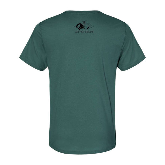 Jester Goods Logo and DE-NY-FEND-POSE Graphic Organic Crewneck Tee